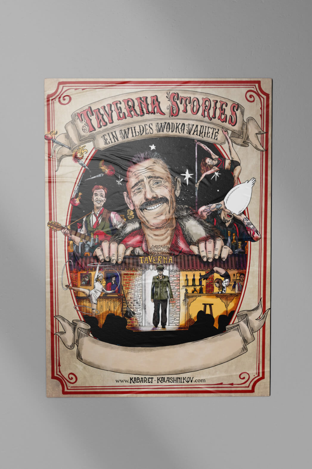 Plakat für das Kabaret Kalashnikov – rebellisch, feuchtfröhlich und durchtränkt von Performance-Kunst und (un)politischem Theater.