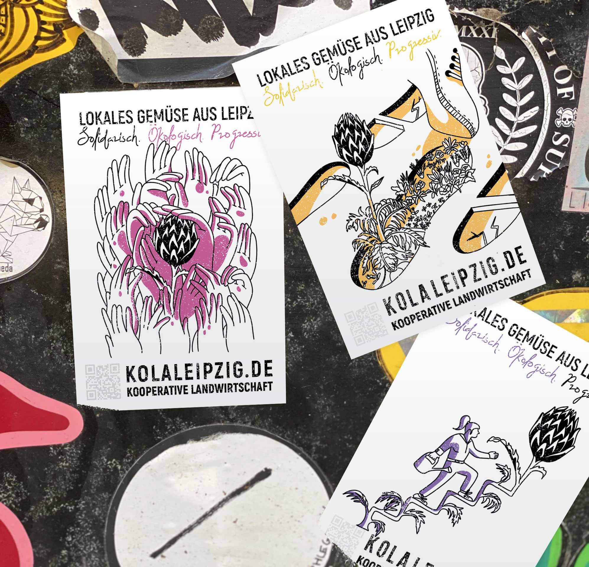 Drei Sticker-Motive für Kola Leipzig: Solidarisch, ökologisch, progressiv – Bäm. Eat that.